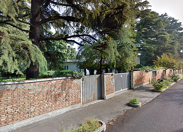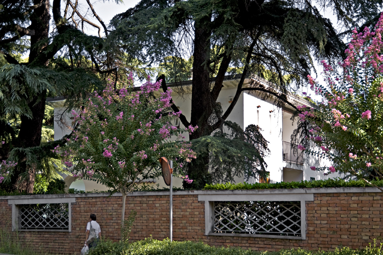La villa occupa il centro di un lotto in una posizione isolata ed intima distante dal confine. Il terreno non presenta dislivelli e l’assenza di un basamento, fa si che l’edificio risulti completamente radicato al suolo erboso. Alla casa si giunge attraverso un marciapiede a partire dal confine recintato con un muro in mattoni a vista che contrasta con lo sfondo della casa intonacato di bianco.