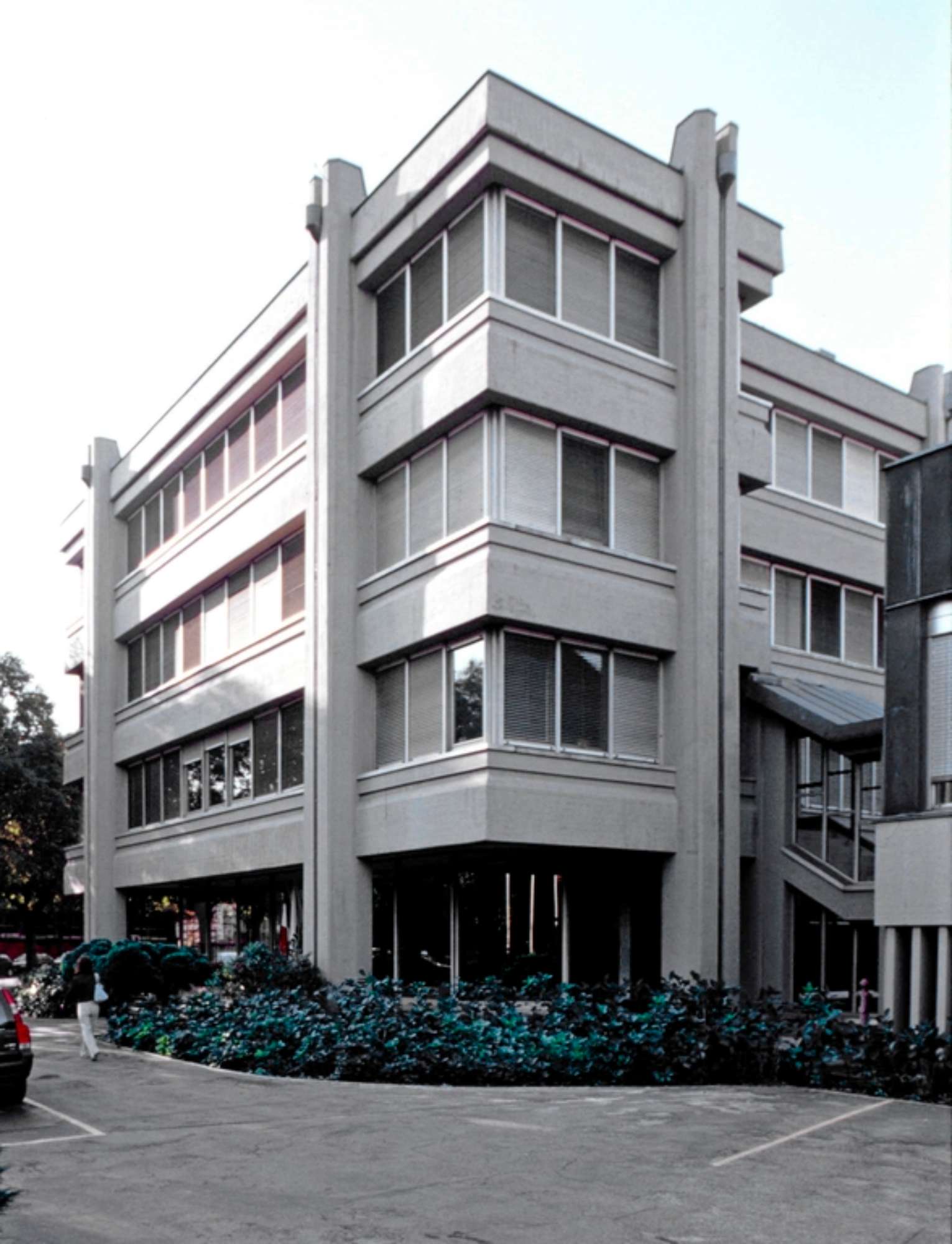 La palazzina è di forma cubica e si sviluppa su quattro piani. Lungo tutti i suoi lati corrono finestre a nastro che si incontrano negli spigoli dell’edificio, definendo quattro finestre ad angolo al primo, secondo e terzo piano. Il piano terra si presenta più aperto sul prospetto Nord, dove una grande vetrata sostituisce le pareti degli altri tre lati, aventi solo finestre puntuali. Al piano terra un arretramento dell’edificio definisce una loggia che indentifica l’ingresso alla struttura e accoglie il cliente. Al calcestruzzo è affidato il compito di costruire l’immagine dell’edificio che si avvale anche della presenza ben visibile dei giunti che ne sottolineano l’aspetto “costruttivo” ai solai e ai pilastri che sporgono dal volume, due per lato, interrompendo le finestre a nastro. In accostamento al cemento viene utilizzato il rame per la copertura e i pluviali, che arrivano a terra all’interno di un taglio nei pilastri.