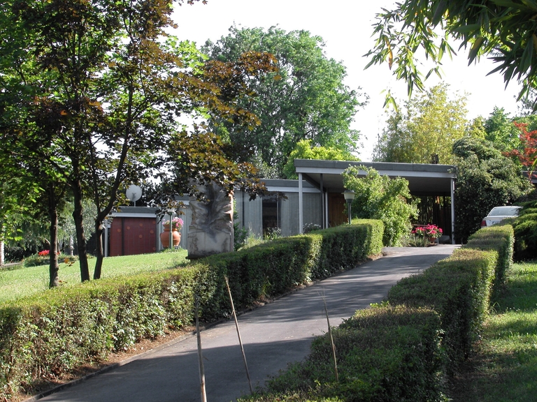 La costruzione si basa su un’essenzialità costruttiva debitrice della lezione miesiana perseguita senza imitazioni, che ben si associa alla regolarità dell’organizzazione in pianta. La casa è posta su un basso basamento che regola le irregolarità del terreno. Non si operano lavori di sbancamento ne di livellamento del suolo, l’abitazione si “appoggia” sul terreno così com’è, assorbendo i vari dislivelli all’interno, mediante pochi gradini. La struttura è in cemento per le parti verticali realizzate come pilastri cilindrici dalla contenuta sezione e metallica per il solaio piano, di cui si lascia a vista l’orditura dei profili delle travi, chiusi da una scossalina metallica che costituisce il coronamento superiore della casa.