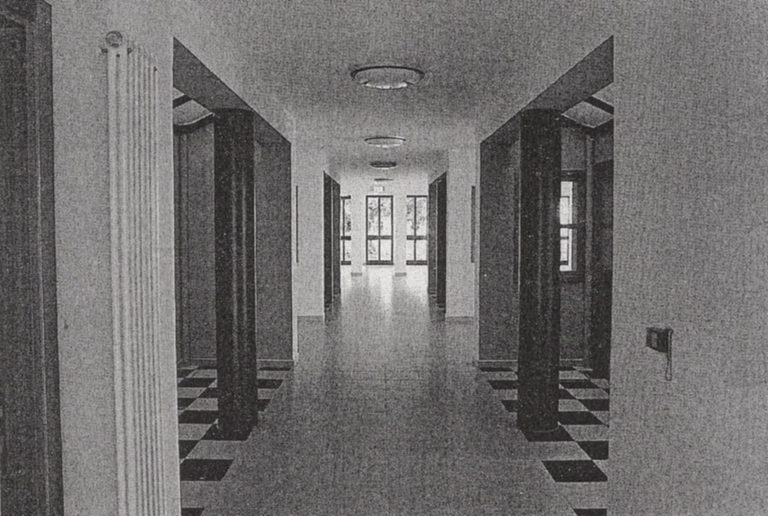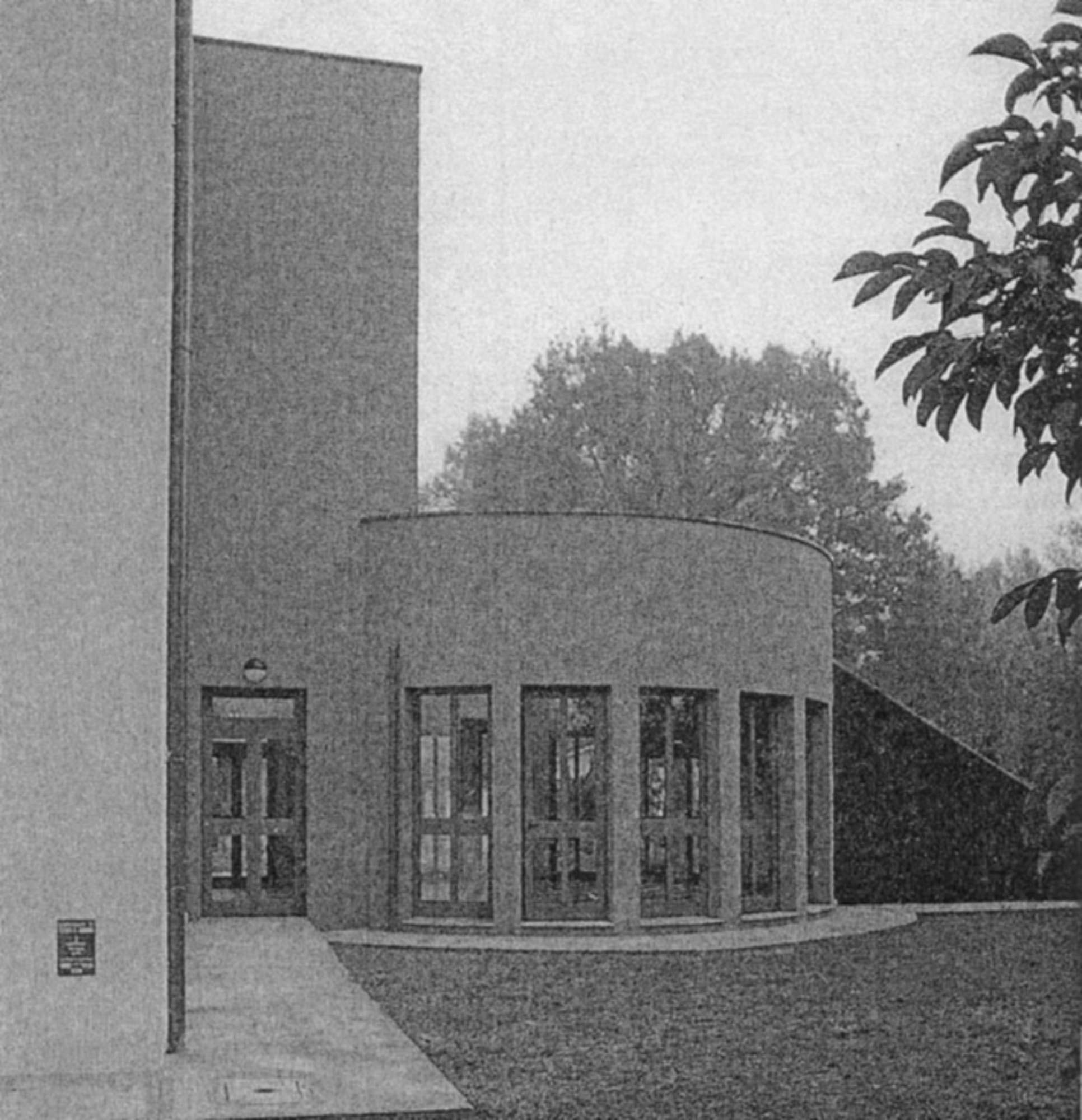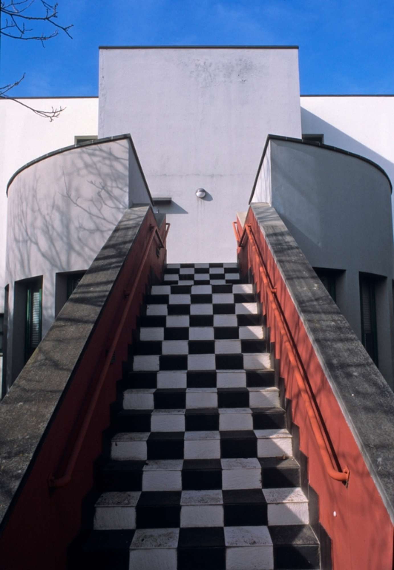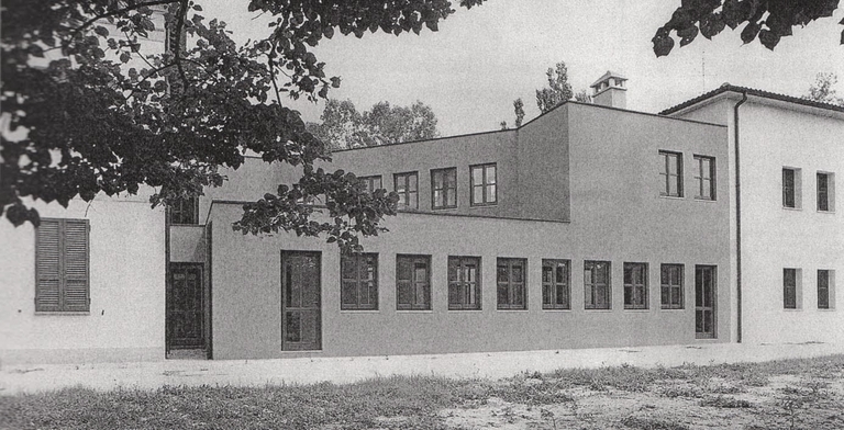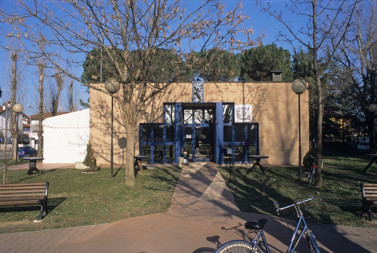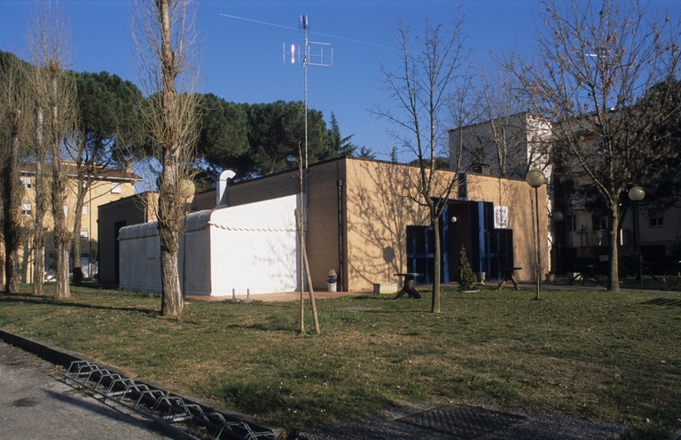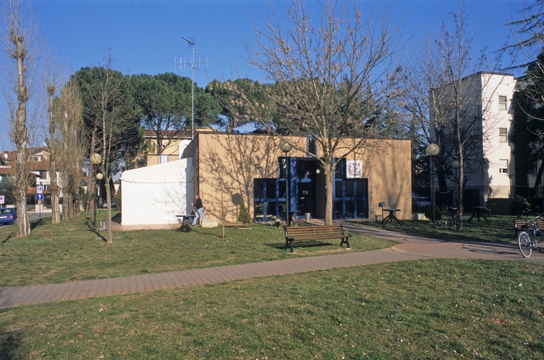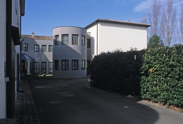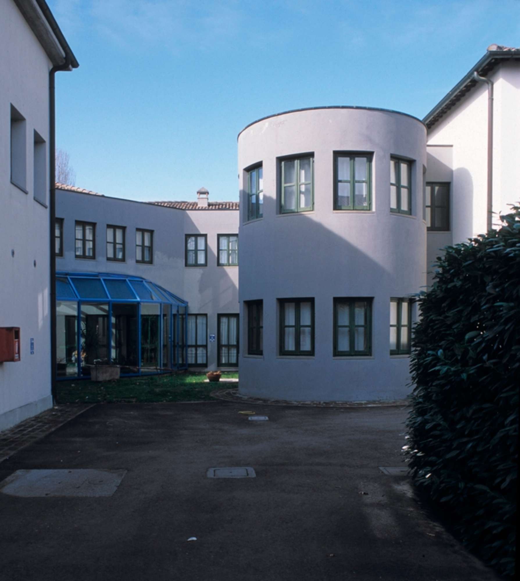Nel 1989 fu chiesto allo studio di ampliare la Casa Protetta, progettata nel 1979, aggiungendo ad essa un Centro Diurno per anziani. L’edificio doveva essere accessibile dall’esterno in maniera indipendente dalla casa protetta e allo stesso tempo essere a questa direttamente collegata. Abbiamo pensato ad un edificio compatto di tre piani, molto aperto sul parco verso il quale sono collocati gli spazi di soggiorno. E’ collegato alla casa protetta da percorsi al piano terra e al primo piano che si attaccano a quelli esistenti nel punto in cui è collocata la serra, il cuore del precedente intervento. Le camere da letto sono poste sui lati e sono distribuite da un corridoio centrale che è illuminato da quattro chiostrine lungo le quali sono stati collocati i bagni. Queste chiostrine al piano terra sono coperte da lucernari e costituiscono volta a volta luogo di sosta e conversazione, ingresso alla palestra, cucinetta di piano. Esse sono anche l’elemento organizzatore in senso architettonico e geometrico del piano terra che è poi il Centro Diurno vero e proprio. Attorno ad esse si dispongono infatti il grande loggiato, che è anche ingresso, la sala soggiorno, quella per il riposo, la palestra, i bagni e la chiesetta. I tre piani sono distribuiti oltre che da un ascensore anche da una scala rotonda illuminata dall’alto. Essa si attacca ortogonalmente all’edificio nei primi due piani e al secondo in maniera sghemba. La chiesetta è posta sul retro ed è l’unico elemento architettonico articolato. E’ un cilindro ampiamente vetrato in cui si incastra in maniera volutamente dichiarata una scala di sicurezza. Questa raggiunge il tetto della chiesa che a quel punto diviene terrazzo. Sul terrazzo si appoggia poi un prisma completamente chiuso e illuminato dall’alto che si aggiunge al corpo dell’edificio principale. In questo ulteriore volume è collocata la scala di sicurezza. I materiali e i colori sono gli stessi della casa preesistente.