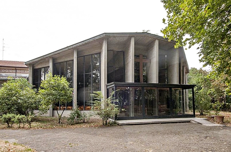 La chiesa sorge a nord della città all’interno di un parco secolare, la cui unica pree-sistenza è costituita da uno chalet in stile svizzero che viene destinato a canonica e opere parrocchiali. è la prima delle chiese post conciliari di Manfredini. è costituita dalla sala delle assemblee, dalla cappella feriale sul cui altare è un’immagine della Madonna del pittore Poggeschi tradotta in ferro smaltato, dalla penitenzeria e dal fonte battesimale. La sala delle assemblee ha come fondale verso l’altare, un muro pieno in calcestruzzo, mentre sul lato opposto ampie vetrate si aprono verso l’emergenza naturale del parco. è realizzata in calcestruzzo armato a vista e i muri perimetrali sono fortemente segnati dalle impronte volutamente irregolari della casseratura, con profonde rigature orizzontali in corrispondenza delle riprese di getto.