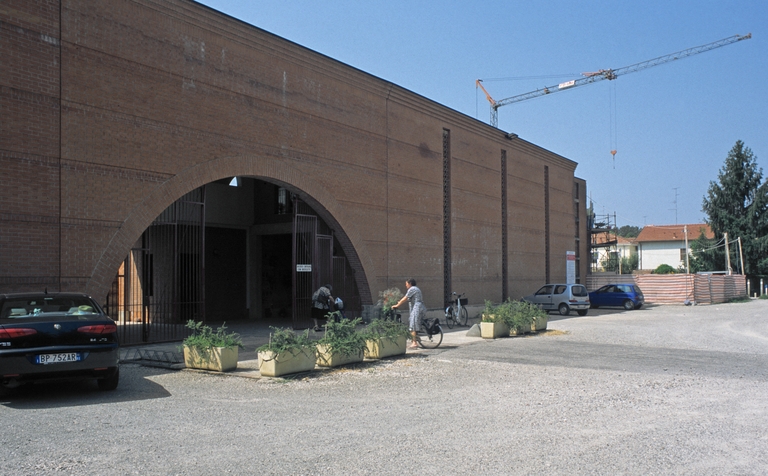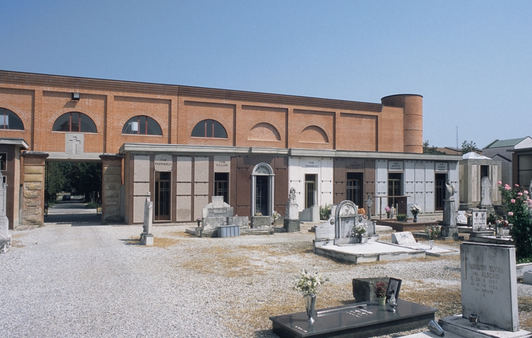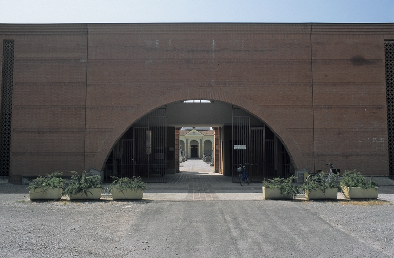 Una quinta muraria in mattoni ricompone in un'immagine unitaria il profilo articolato delle cappelle gentilizie addossate al recinto del cimitero novecentesco. Procedendo dal viale di tigli che unisce la piazza al camposanto appare un grande arco a sesto ribassato ritagliato nella muratura che incornicia il porticato di ingresso al cimitero. La forza espressiva della quinta muraria vuole evocare il monumentale palazzo Bentivoglio, simbolo della città, del quale sono stati reinterpretati i codici compositivi: il rapporto tra masse murarie, le torri d'angolo, il ritmo delle grandi aperture e l'uso del mattone nelle sue applicazioni tettoniche e decorative. Il doppio volume dell'ingresso, attraversato da una galleria che unisce le ali con la successione delle tumulazioni, è illuminato da una croce ritagliata nella copertura dalla quale penetra una luce zenitale.