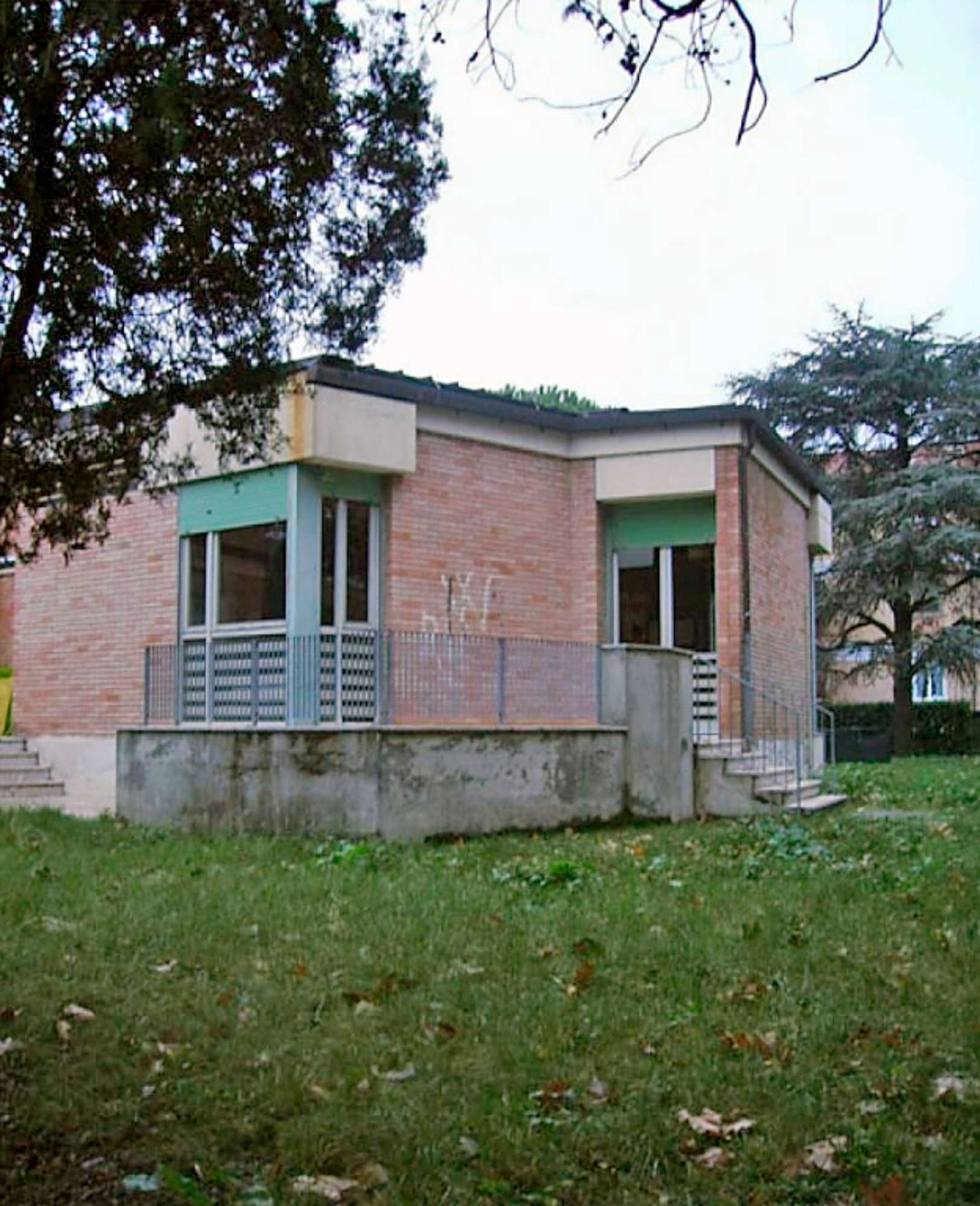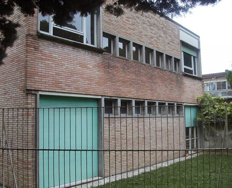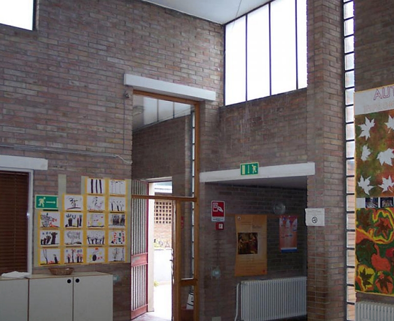 La stessa varietà in pianta è ben visibile anche in alzato. Dall’esterno la composizione appare come una serie di volumi individuali singolarmente e differenziati in funzione delle attività legate agli spazi interni che racchiudono. La destinazione d’uso degli ambienti determina anche la varietà delle bucature che contribuisce all’articolazione compositiva del complesso. L’utilizzo del mattone, poi, da una parte permette l’uniformazione alle scelte formali dell’intero quartiere, dall’altra rappresenta l’elemento unitario che lega insieme la frammentazione volumetrica.