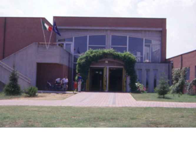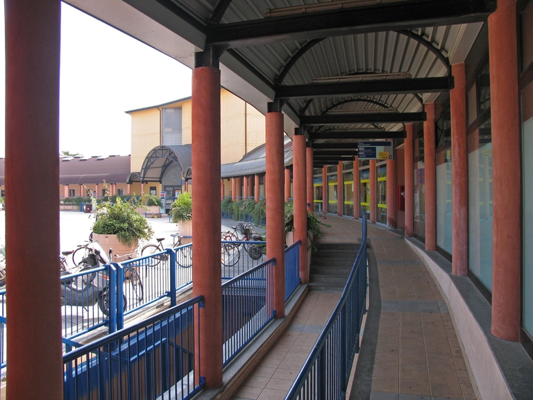 Il prospetto sulla piazza è caratterizzato dal lungo porticato sopraelevato di circa un metro rispetto al piano di calpestio dello spazio pubblico. Il colonnato, a sua volta, protegge il tamponamento in mattoni intonacati esterno dell'hangar, sul quale, a scansioni regolari, sono collocati infissi metallici quadrati.