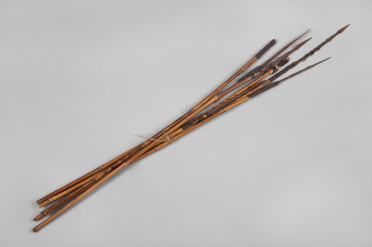 Gruppo di sette frecce in canna con punta in metallo assemblata attraverso filo di cuoio