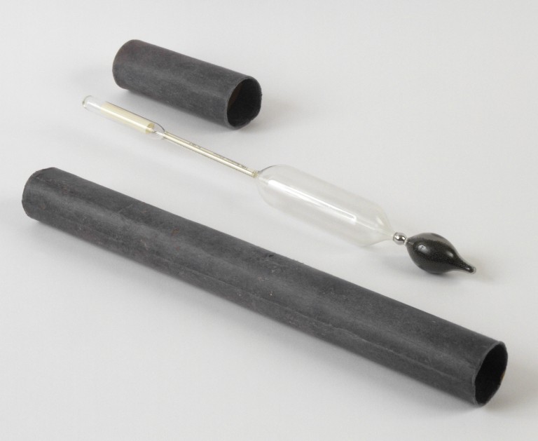 Lo strumento si presenta come una lunga ampolla di vetro, con un bulbo finale da una parte, una stretta canula al centro e terminante con una canula conenente un termometro sull'altro lato. All'interno presenta una scala graduata scritta su un foglio di carta inserito all'interno. Lo strumento è contenuto in una custodia cilindrica di cartone.