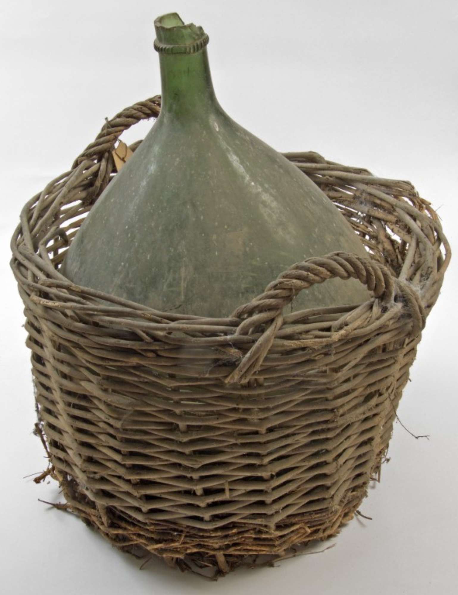 Grande damigiana, a bocca stretta, provvista di impagliatura per il sostegno e trasporto