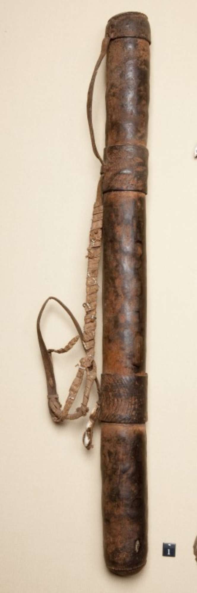 Turcasso per frecce in legno e cuoio decorato con conchiglie di ciprea.