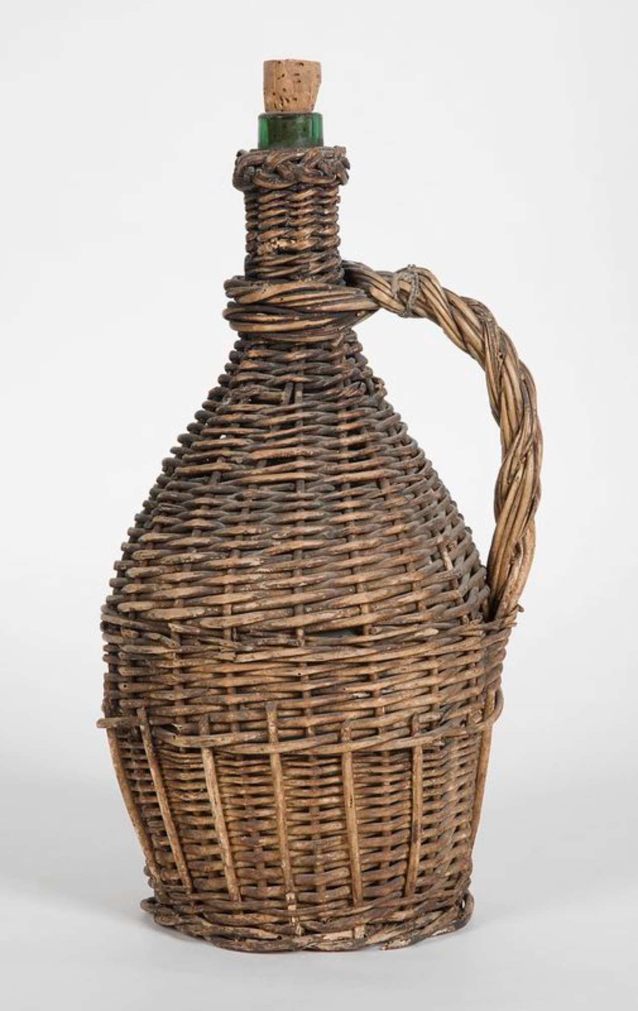 Fiasco di vetro, rivestito di fibra vegetale intrecciata, dotato di manico rigido e tappo di sughero.
