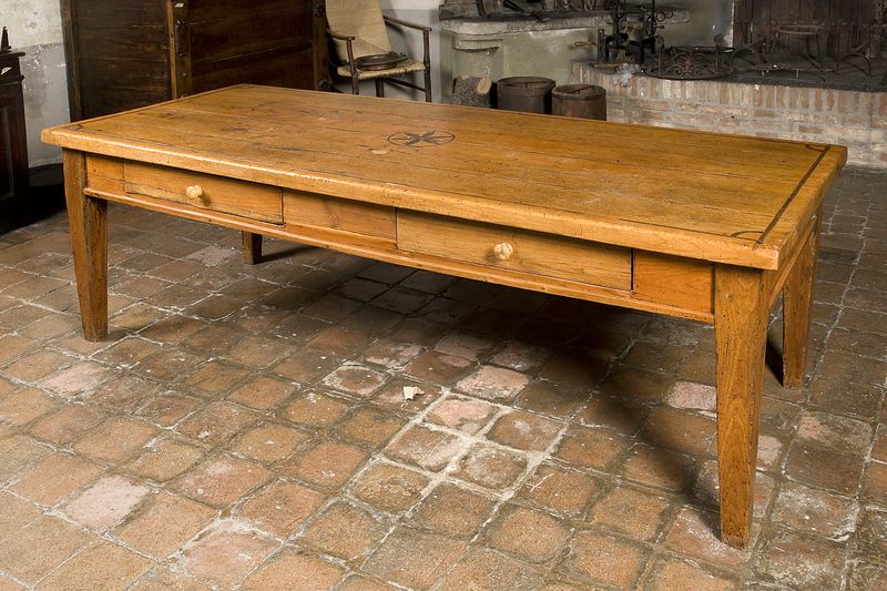 Nell'inventario della Rocca di Dozza del 1987 è segnalato un tavolo con intarsio a stella nel centro; nell'inventario del 1812 è invece citata una "tavola lunga di noce con due cassette".