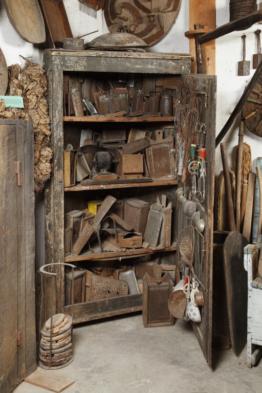 Funzione: mobile angolare a tre ripiani con anta sul lato destro, utilizzato come contenitore per suppellettili da cucina, oppure per alimenti
