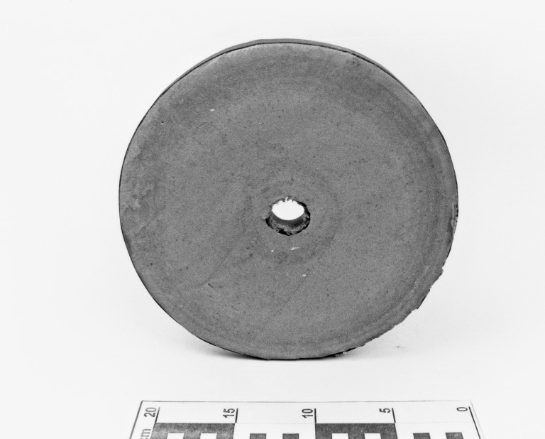Disco in legno con foro centrale su cui è stato incollato un foglio di carta abrasiva a grana fine. Intorno al disco vi è un anello di ferro.