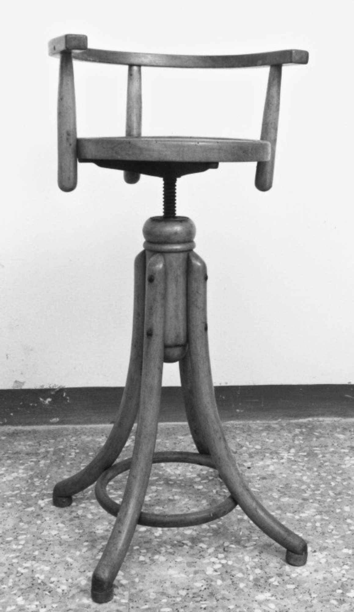 Piede formato da quattro zampe a sezione circolare e dall'andamento curvilineo, unite nel punto di massima curvatura da un anello ligneo. Le estremità inferiori delle gambe poggiano su tappi cilindrici, mentre quelle superiori sono avvitate in due punti sovrapposti ad un cilindro modanato, nel cui centro si innesta una vite a cui convergono tre barre di acciaio equidistanti. A queste è fissato il piano del sedile, costituito da un disco di legno, leggermente concavo. In tre punti tangenti il disco e ortogonali tra loro sono fissati tre paletti a sezione circolare, rastremati verso l'alto, sulla cui sommità è fissata una barra di legno semicircolare a sezione rettangolare, la quale funge da schienale. Sotto il sedile, lungo il bordo interno, c'è un'etichetta con la scritta nera "THONET" fiancheggiata da due "T" bianche inserite in due cerchi neri decorati con ghirigori bianchi.