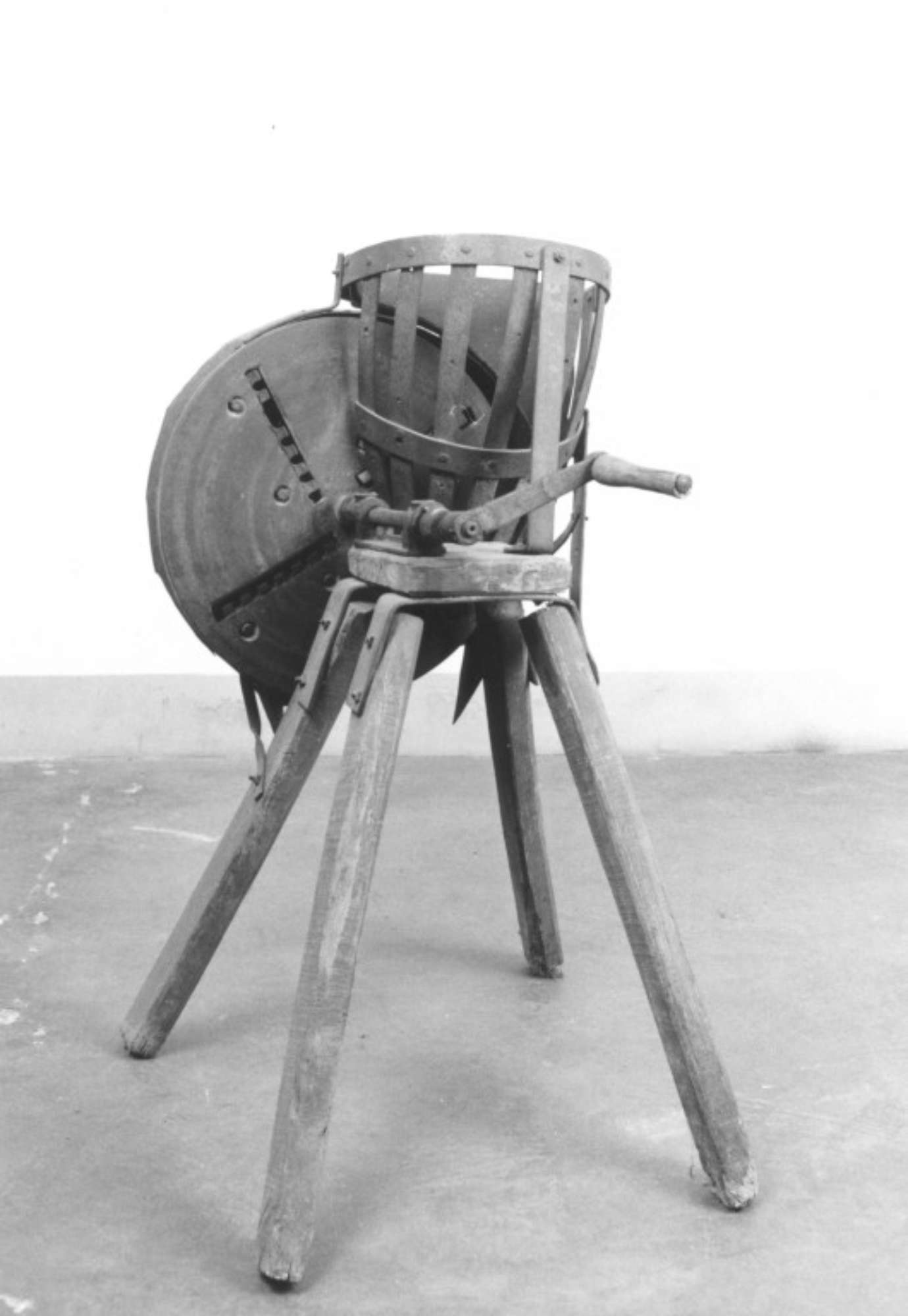 Grattugia a disco. Sopra a quattro gambe in legno è fissato un perno collegato ad una manovella che fa girare un tamburo in acciaio provvisto di fessure con denti acuminati per tranciare. Di fianco al tamburo è posto il cesto, a tronco di cono, formato da listelli di acciaio verticali, entro cui si pongono le barbabietole da trinciare.