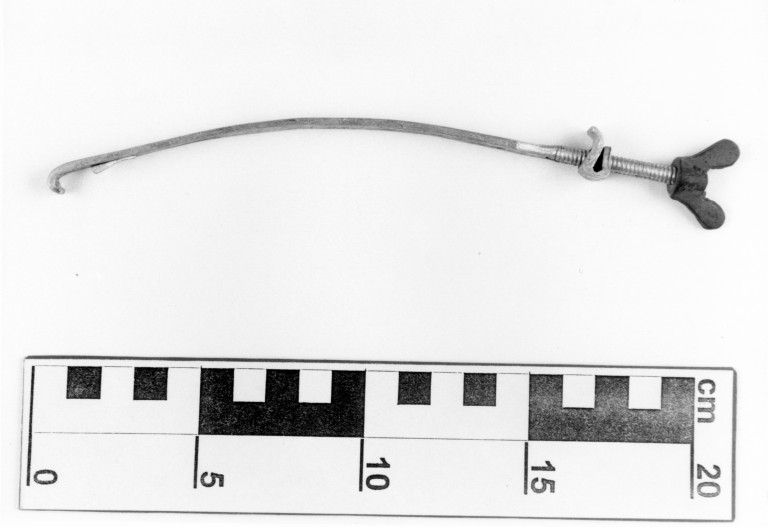 Attrezzo lungo e sottile con punta ricurva allargata e con una vite inserita nell'estremità superiore.