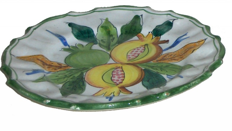 piatti di ceramica con orli lavorati, decorati diversamente con uva, arancia, prugna e melograno