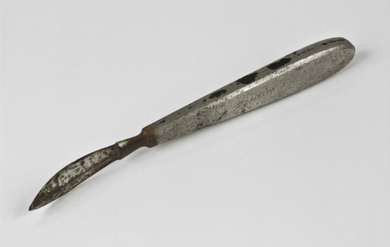 bisturi con la lama sagomata simmetrica a foglia e con la punta tagliente da ambo i lati
