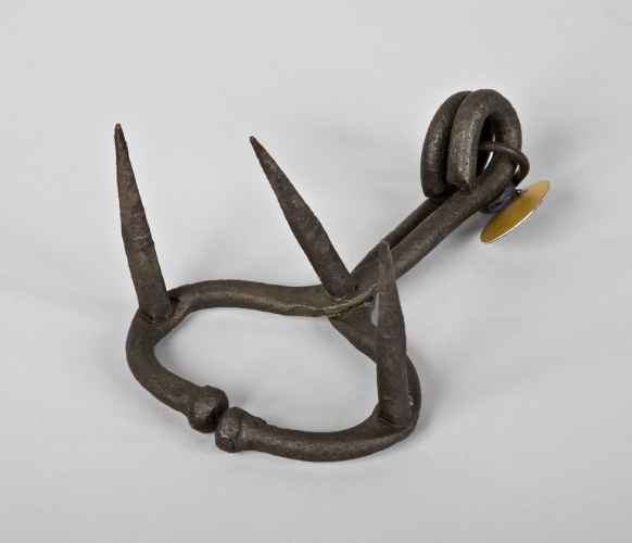 strumento a due bracci ricurvi, collegati mediante un perno, terminanti da una parte con una piccola forma sferica e con un lungo chiodo saldato, dall'altra la barra si avvolge su se stessa per formare un anello