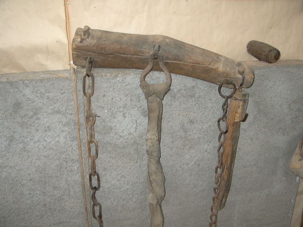 trave di legno con anelli di ferro e cinghie di cuoio