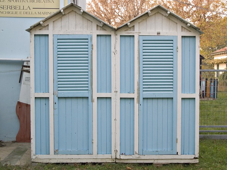 cabina da spiaggia in legno, anni cinquanta, di colore bianco e azzurro