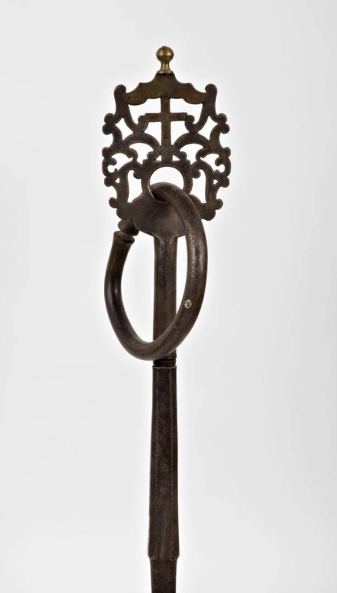 Caviglia da timone (statoio), usata per bloccare il timone al giogo con funzione frenante. La pagella presenta al centro una croce in bronzo circondata da elementi sinuosi. Un anello. Cimasa a corona terminante con un pomello in bronzo.