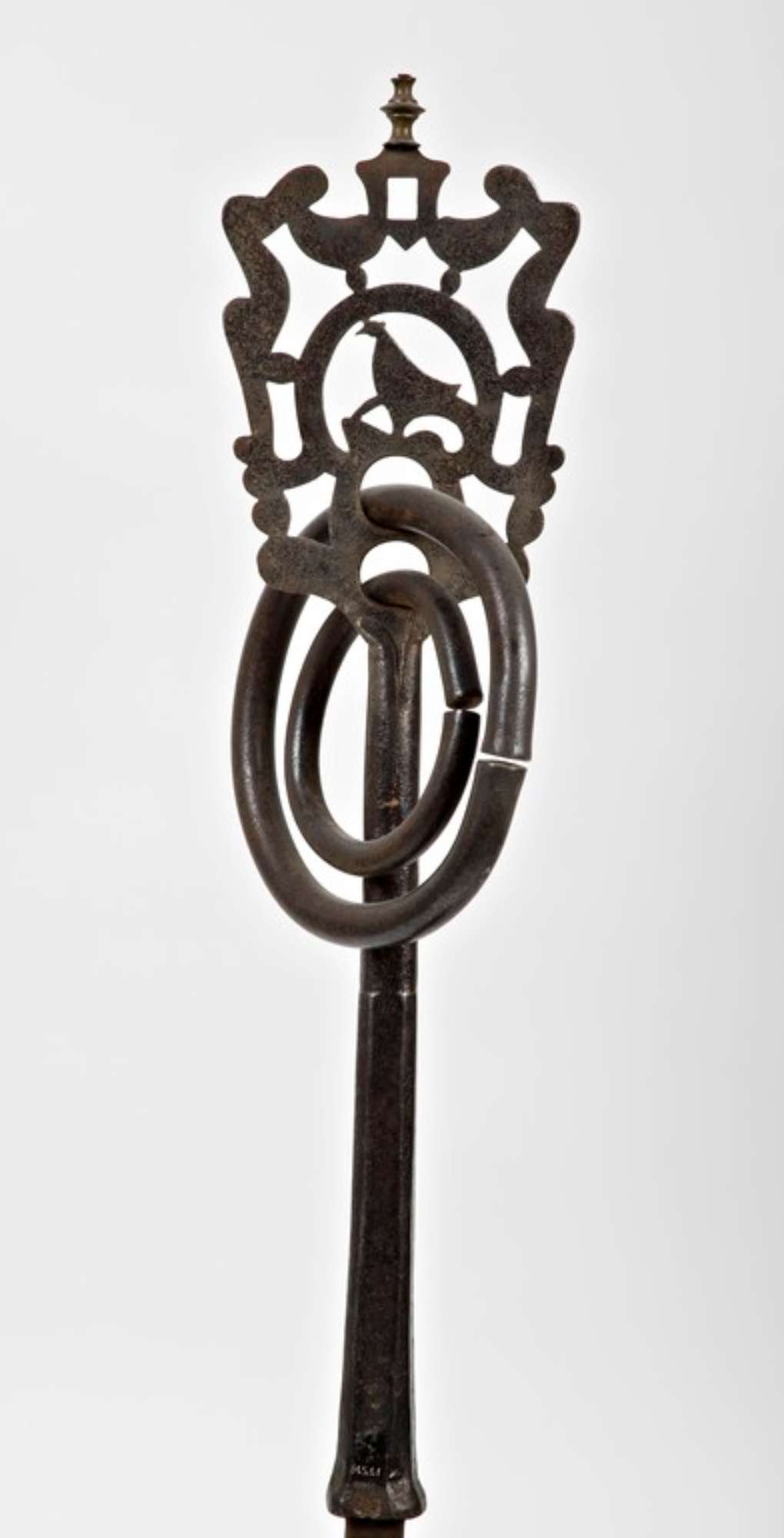 Caviglia da timone (statoio), usata per bloccare il timone al giogo con funzione frenante. Caveja a due anelli a sezione rotonda; la pagella presenta al centro la figura del pavone (interpretazione cristiana) o del gallo (simbologia agreste), sormontata da un arco, che a sua volta simboleggia il cielo. Ai lati sono rappresentate due figure umane stilizzate che sostengono una corona sormontata da un elaborato pomello in ottone.