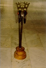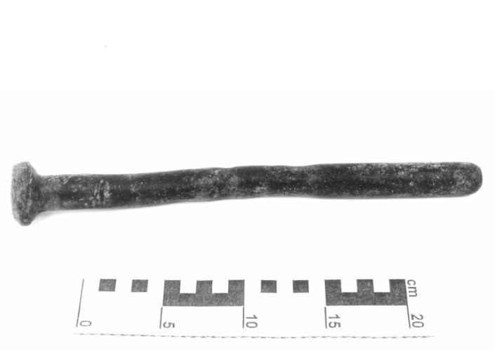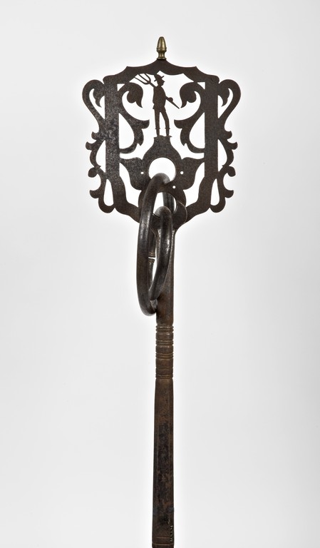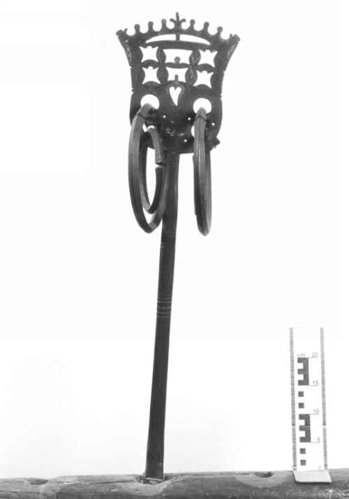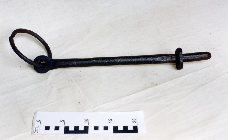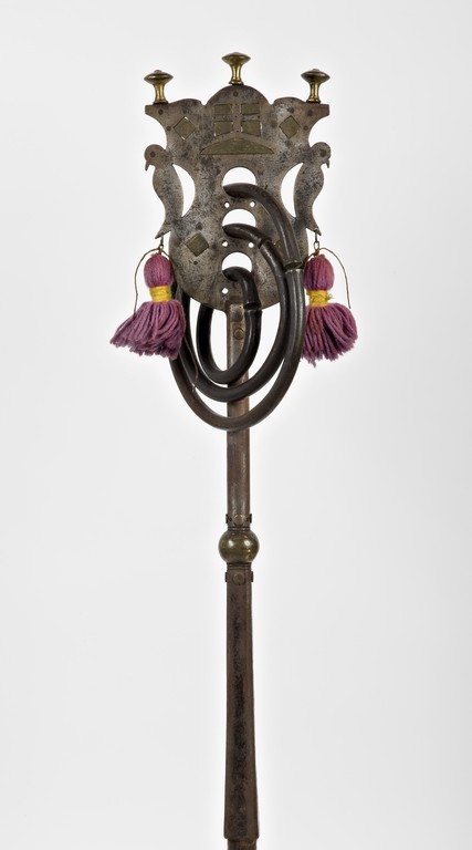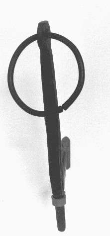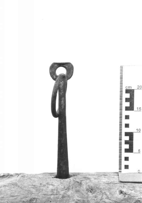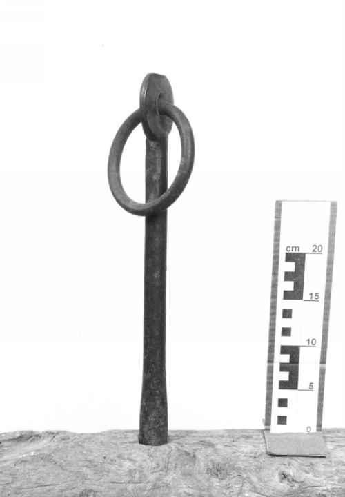 Caviglia da timone (statoio), usata per bloccare il timone al giogo con funzione frenante. La caveja testimonia chiaramente l'appartenenza all'epoca fascista, sia nello stile rigido sia nel contenuto, rappresentato dal simbolo fascista con ai lati le due stelle della disciplina militare. Reca infatti la data del 1930. Due anelli, nappe di lana e alcune parti in cuoio.