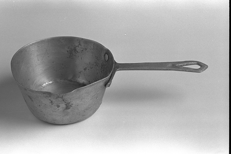 Particolarmente leggero, è costituito da una concavità tronco-conica, con accenno di un beccuccio sul lato sinistro, che interrompe la simmetria del bordo. Il manico, particolarmente corto, presenta all'estremità un foro allungato, per essere appeso.