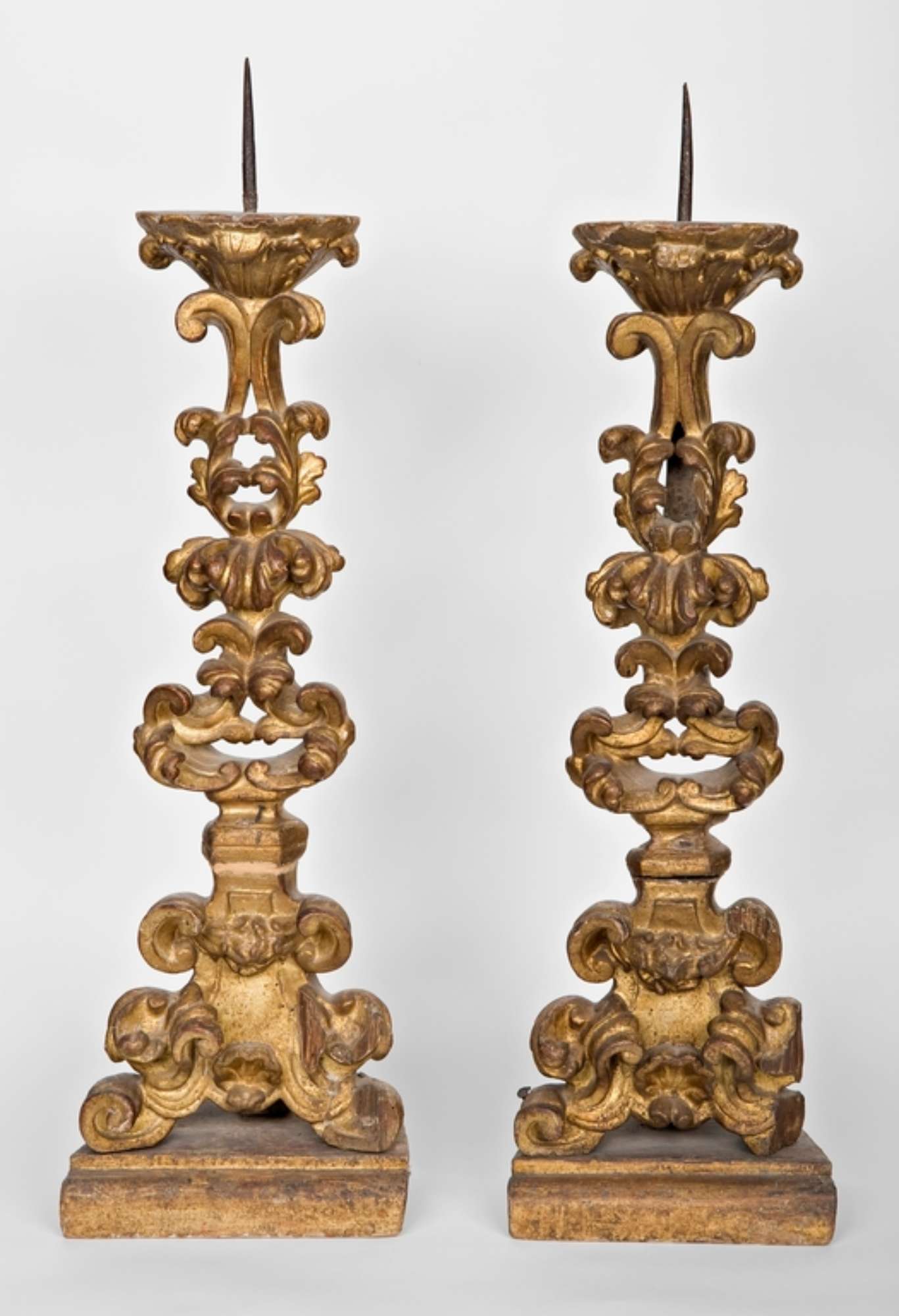 Candelabro con base trapezoidale su cornice arrotondata nella parte anteriore. Il fusto è interamente intagliato con rigogliosi motivi vegetali e motivi a riccioli, mentre sia alla sommità che alla base è decorato con un motivo a conchiglia. Nel retro è rinforzato con ua lamina di ferro.