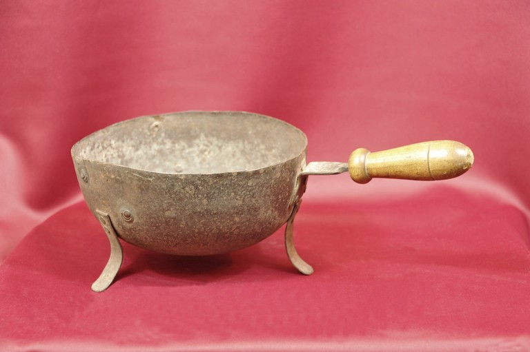 scaldino contenente le braci da mettere nello scaldaletto (prete), ricavato da un elmetto tedesco della seconda guerra mondiale opportunamente tagliato subito sopra alla falda.