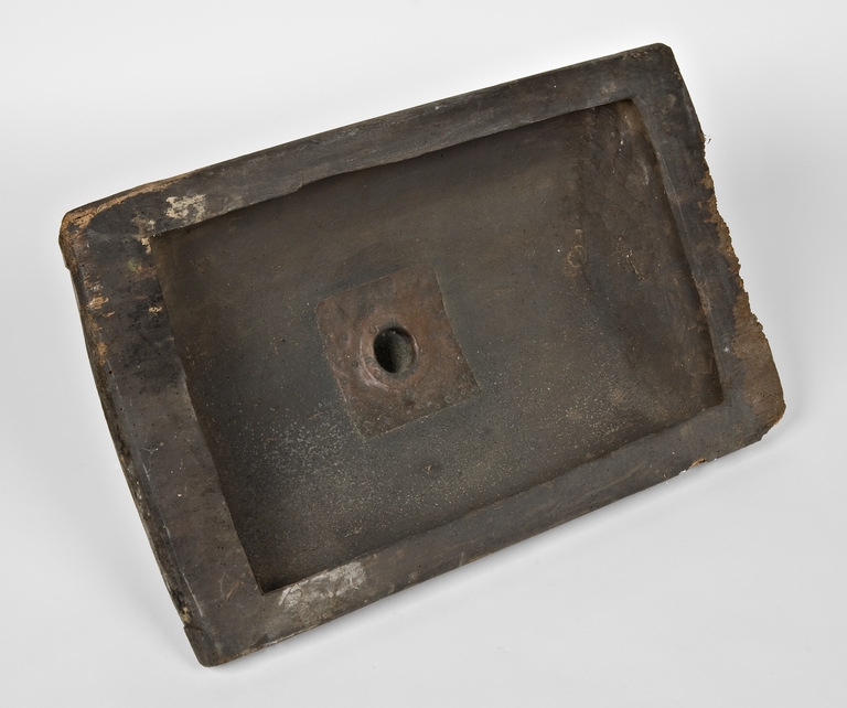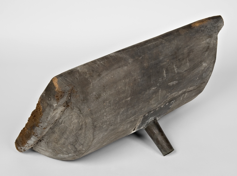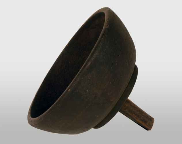 Imbuto a forma di vaschetta rettangolare, con applicato sul fondo un cilindretto in rame che permetteva il passaggio del mosto dalla vaschetta al tino o altro contenitore