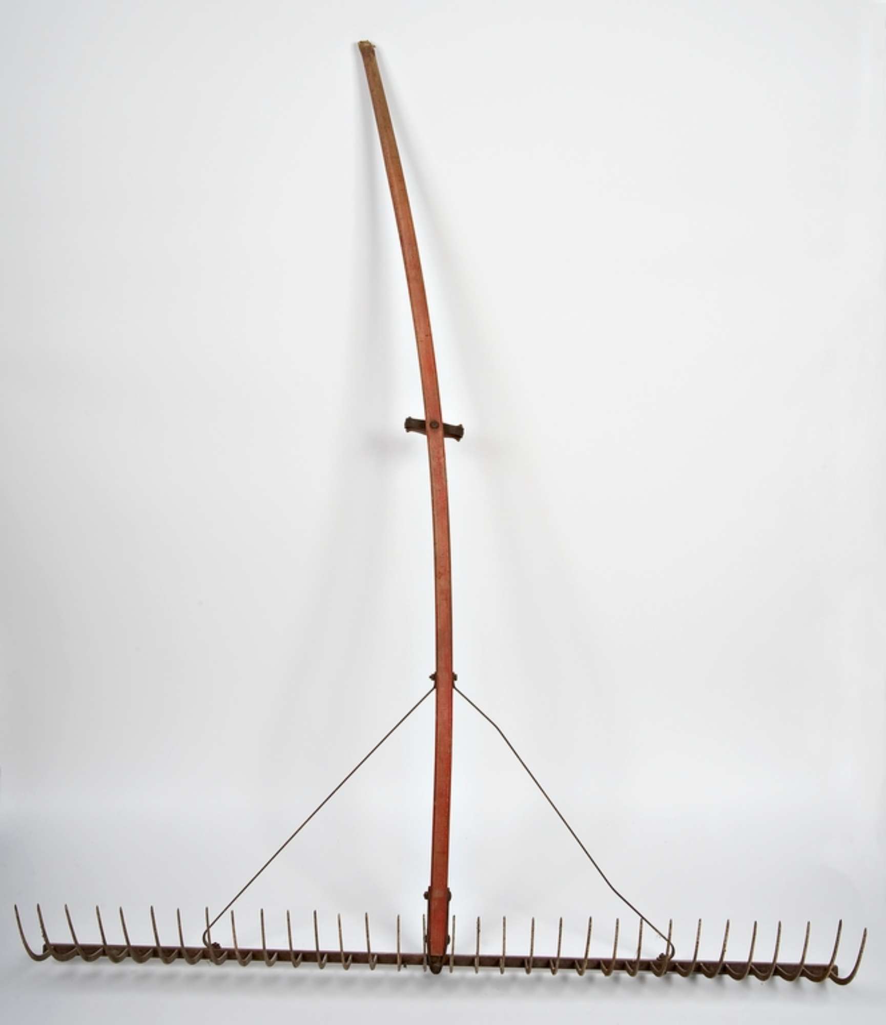 Strumento con lungo manico e ampio pettine con molti rebbi. Maniglia al centro del manico