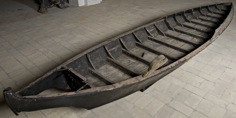 Imbarcazione a remi di forma allungata, con listelli in legno fissati all'interno, a distanza regolare