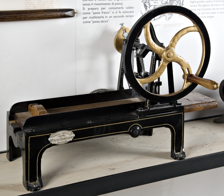 Attrezzo utilizzato per la produzione domestica e/o artigianale. Una targhetta metallica posta sul macchinario indica che fu realizzato dall’Officina meccanica Bartolomeo Ballari di Parma, specializzata nella costruzione di impianti per mulini, pastifici, fabbriche di concentrato di pomodoro (fu tra le prime ad introdurre i concentratori cilindrici) e di motori idraulici. Si tratta di una delle ditte più antiche di Parma, fondata nel 1872 da Bartolomeo Ballari (1840-1898) e gestita ininterrottamente dallo stesso nucleo familiare per oltre 120 anni.