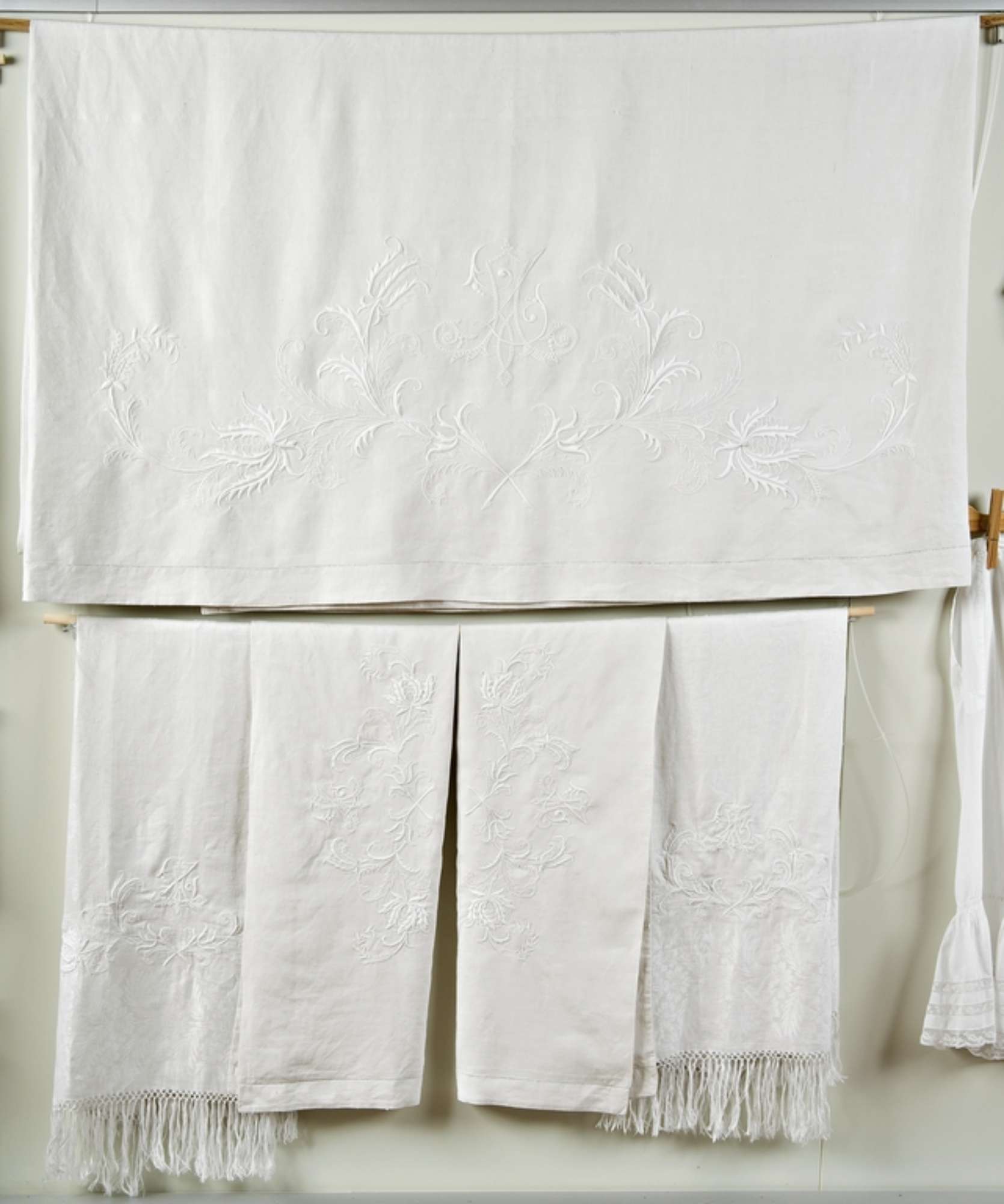 Parure composta da lenzuolo, due federe e due asciugamani ricamati. Il lenzuolo matrimoniale ha, nel risvolto, un orlo a giorno doppio e, nella parte inferiore centrale, un ricamo floreale con rami intrecciati e al centro il monogramma di Argia Zanzi. Il ricamo delle federe è eseguito a punto rodi, punto croce, punto pieno, punto erba, punto ombra.