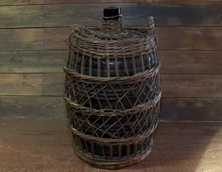 Corpo in vetro con foro inferiore per la spina. impagliatura in vimini con fondo in legno.