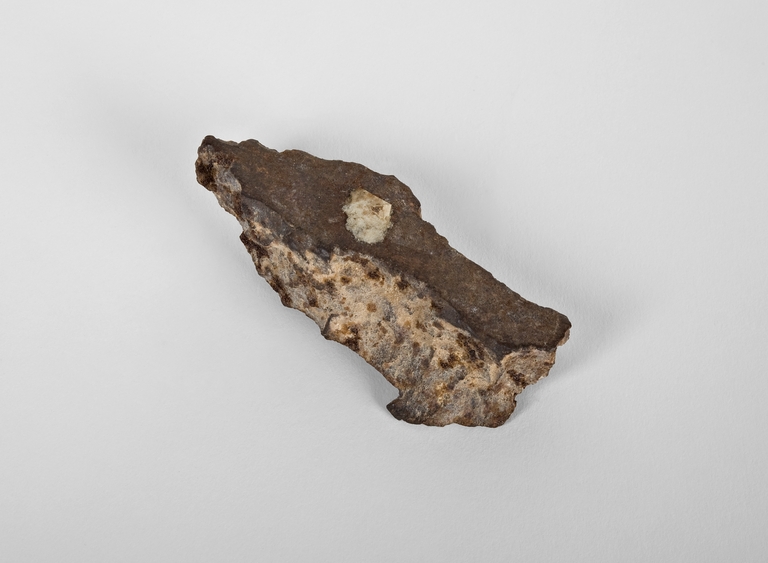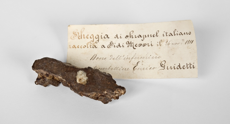 Secondo quanto riportato nella scheda inventariale del manufatto, incluso nella raccolta libica della Croce Rossa, si tratta di una "(78) Scheggia di shrapnel italiano. Lunga cm 5,5, larga cm 1 e dello spessore di mm. 4. Fu raccolta a Sidi Messri il 26 novemb. 1911. Dono dell'infermiere trombettiere Enrico Guidetti". Il materiale confluito nella Raccolta libica della Croce Rossa è stato acquisito dal Municipio di Bologna grazie a diversi donatori, quasi tutti soldati reduci dalla guerra italo-turca (1911-1912). Secondo quanto dettagliava in una relazione scritta per l'assessore alla Pubblica Istruzione (1916) il coevo direttore del Museo Civico del Risorgimento, Fulvio Cantoni, il materiale fu ceduto temporaneamente allo scopo di assolvere alle richieste del Comitato bolognese della Croce Rossa Italiana, impegnatosi a partecipare all'esposizione organizzata nel 1914 per celebrare il cinquantenario dell'ente presso Villa Umberto a Roma, e da quell'iniziativa trae il nome la raccolta. Gli oggetti di cui si compone il nucleo sono stati rinvenuti in anni recenti da Otello Sangiorgi presso i depositi dei musei comunali e durante il presente intervento di catalogazione sono stati in larga parte ricondotti a vecchie schede inventariali, risalenti al 1914, anch'esse ritrovate dallo stesso Sangiorgi in varie ubicazioni nel corso degli anni e verosimilmente redatte all'epoca della mostra del 1914.
