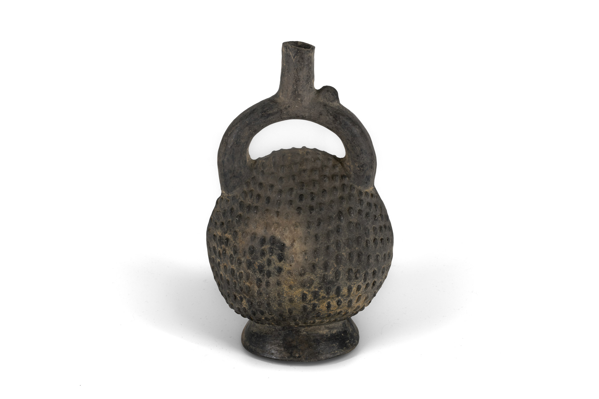 Vaso cerimoniale di forma globulare con base a piedistallo ed ansa a staffa tubolare, simmetrica e munita di collo cilindrico. La porzione globulare del recipiente è decorata a rilievo per mezzo di stampo, da una serie di piccolissime prominenze irregolari. Raffigura probabilmente il guscio di una conchiglia, più precisamente di uno Spondylus princeps. Alla base del collo, su un lato, è visibile una protuberanza arrotondata. Lo Spondylus era sacro sia nell’Amazzonia che nel Perù, dove il suo culto era connesso con la fertilità femminile e della pioggia» (Caterina Rossi).