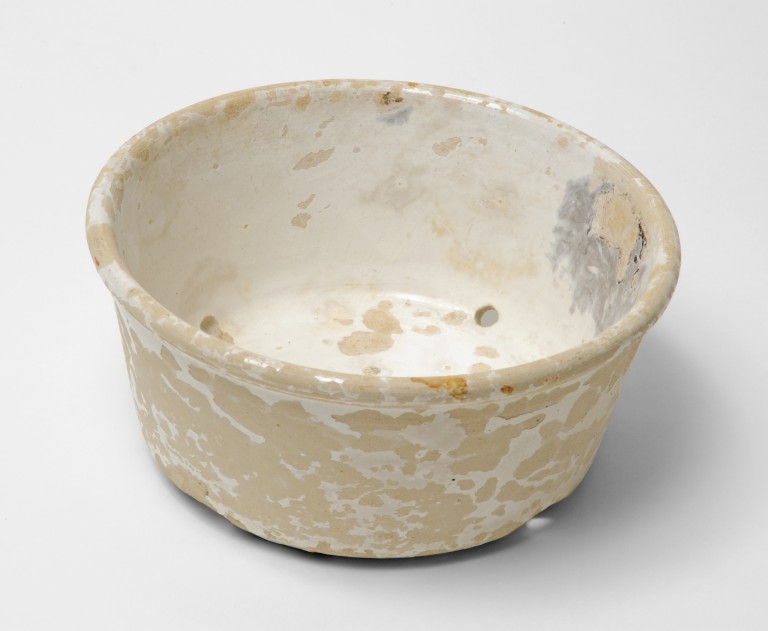 I fiocchi di ricotta raccolti con la ramina dal siero vengono messi a scolare in questo contenitore forato.