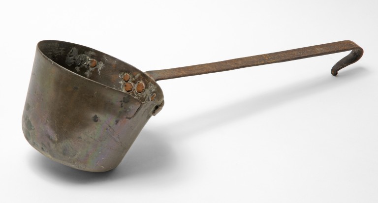Ramaiolo con cucchiaio troncoconico provvisto di beccuccio. Manico rivettato e con estremità incurvata per appendere l'oggetto.