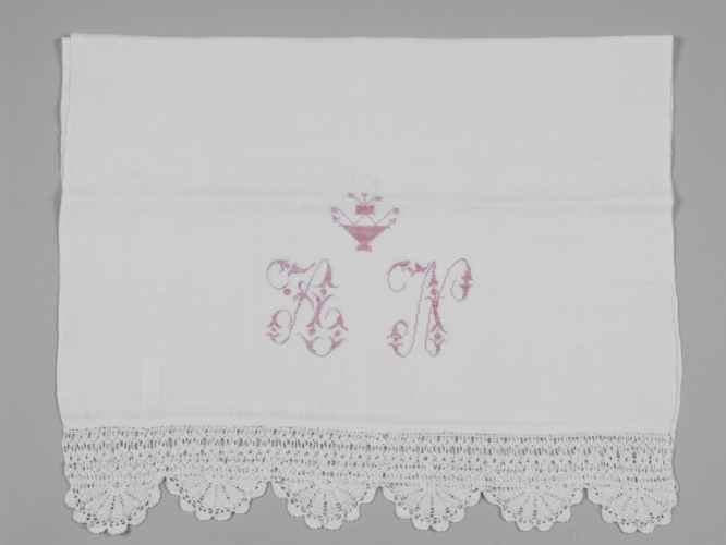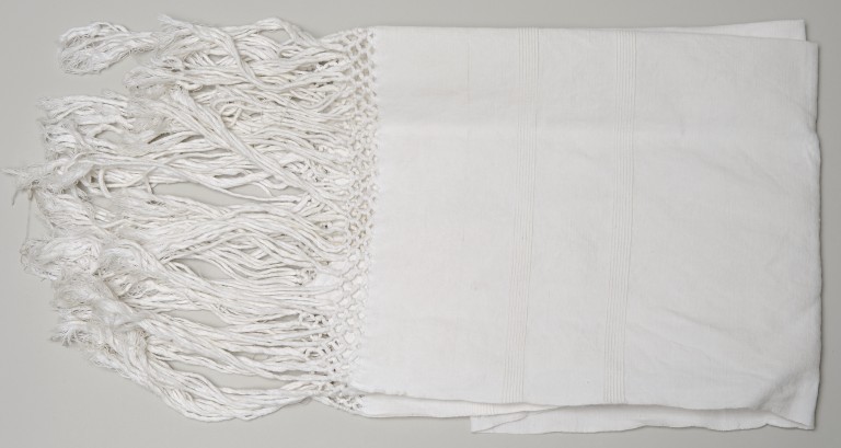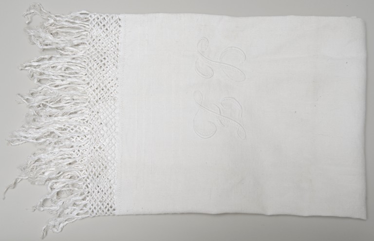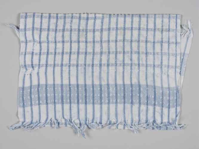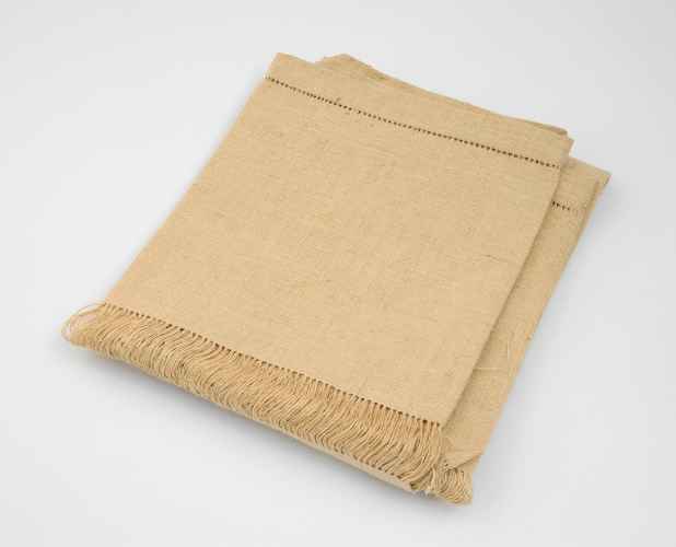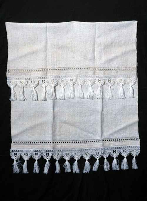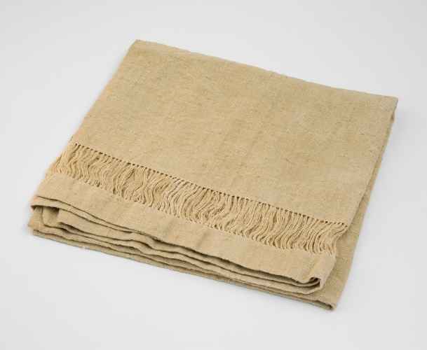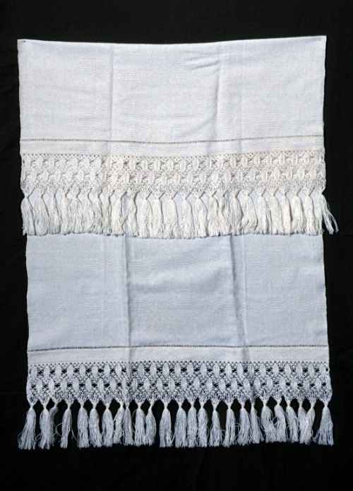 Asciugamano in tela di cotone con lunghe frange e motivo in rilievo ai bordi.