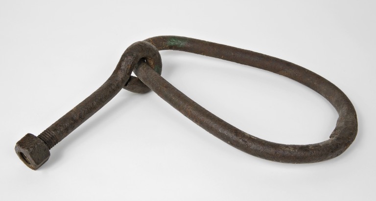 Anello ovale in tondino di ferro con agganciato un bullone con dado.
