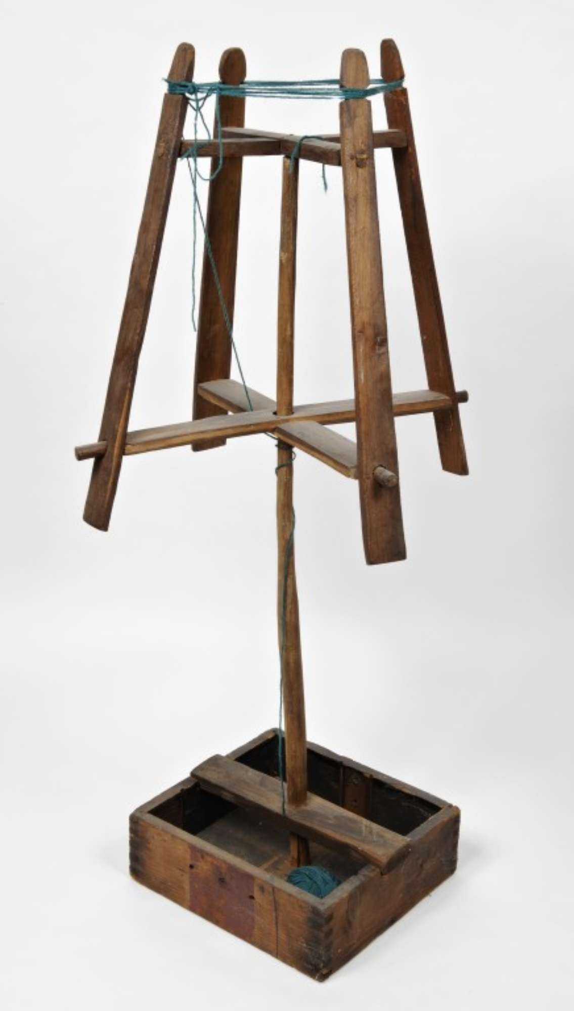 Parte girevole sostenuta da un'asta che funge da perno verticale. La base è una cassettina portagomitoli.