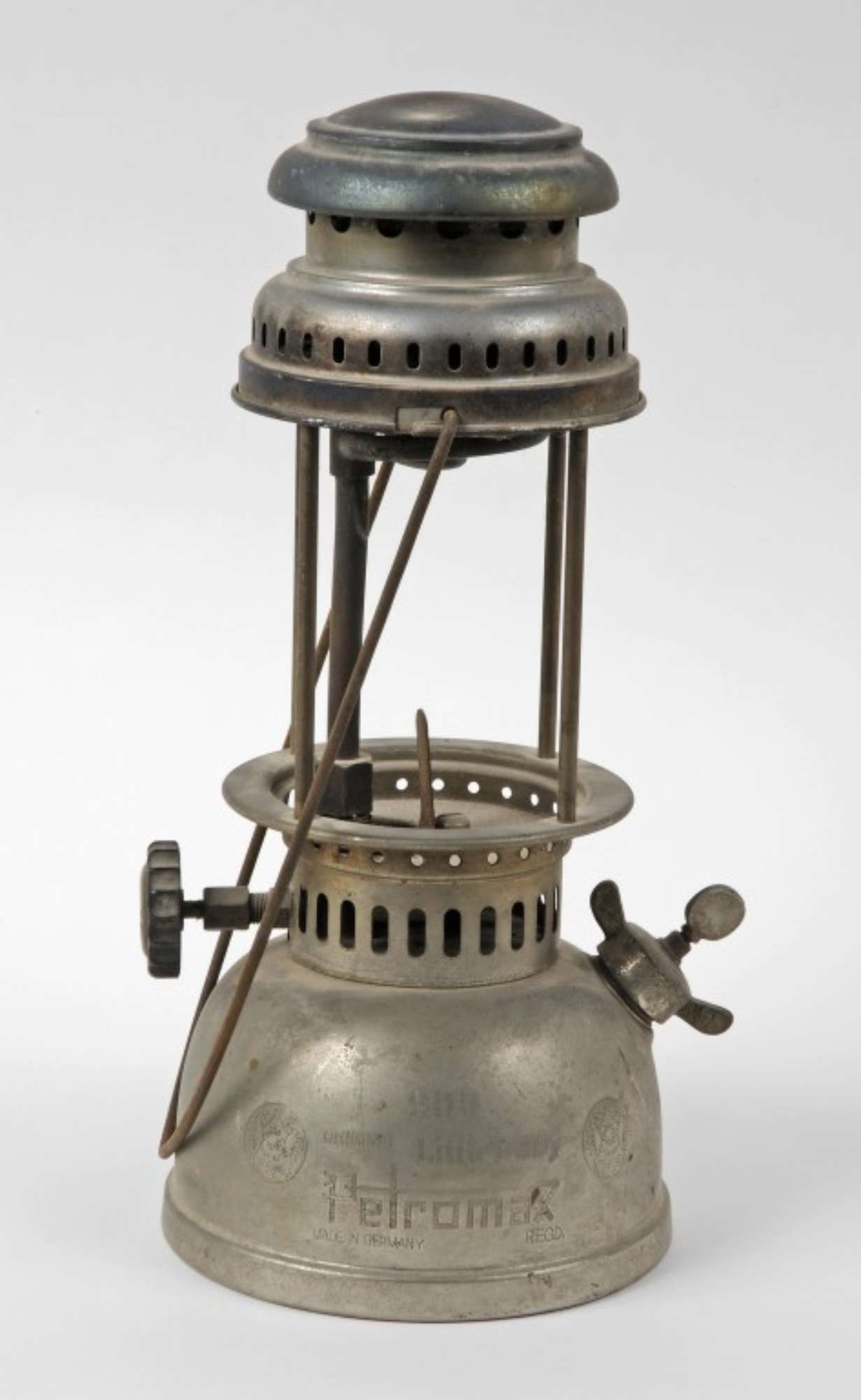 Lampada composta da un serbatoio per il combustibile, dall'alloggiamento della "lampadina" (mancante) e dal manico per il trasporto.