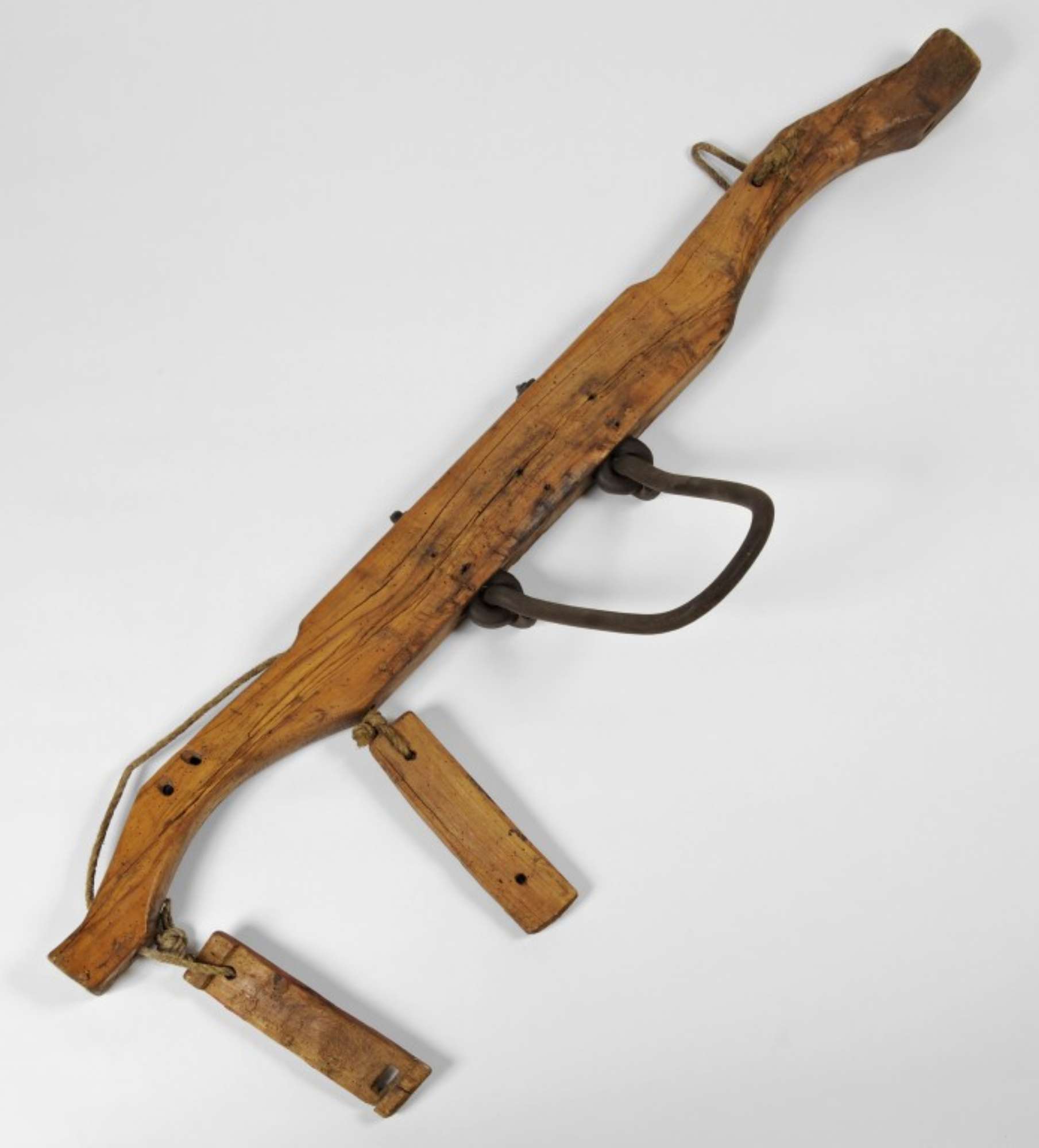 Arnese di legno a forma di asta, massiccio e piuttosto pesante, con cavicchi in legno e elemento a U per il timone in ferro.