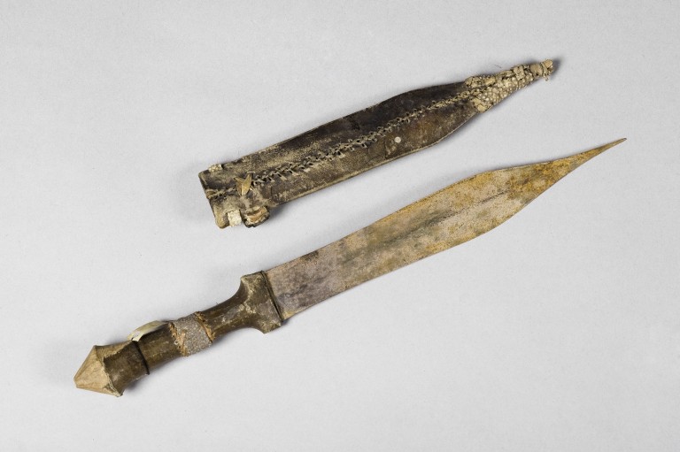 Coltello in metallo ed impugnatura in legno, con fodero. L'impugnatura, rivestita in pelle, è decorata con applicazioni in pelle grigiastra e porosa e con fibra vegetale. Il fodero risulta essere più piccolo ma riporta le stesse decorazioni in pelle.