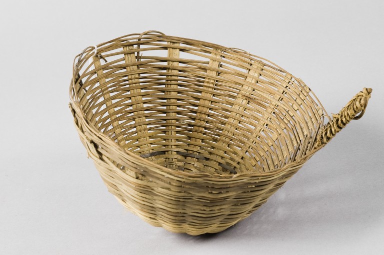 Cesto in fibra vegetale intrecciata di colore scuro con fondo arrotondato e manico laterale. La forma ricorda quella di un mestolo o di uno strumento per filtrare.