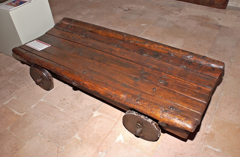 E' costituito da sette doghe di legno inchiodate con grosse borchie per formare un piano di appoggio e munito di ruote per essere spostato con maggior velocità e minore fatica.