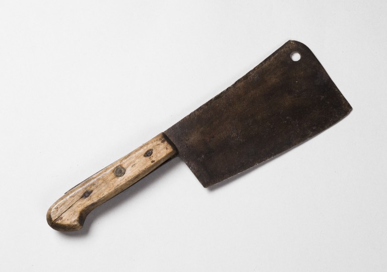 Lama rettangolare con grande codolo stretto fra le assicelle del manico e fissato con perni ribattuti.