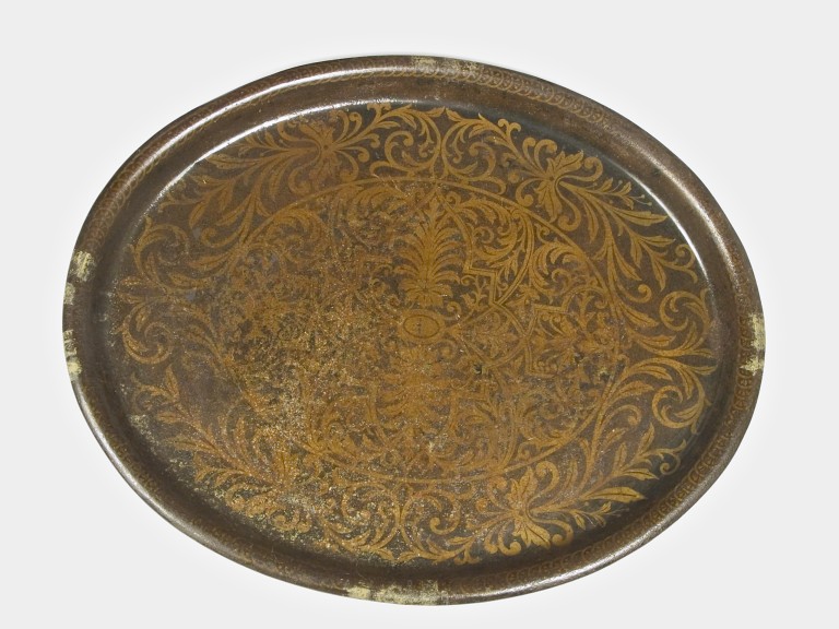 La parte decorativa risulta particolarmente elegante e complessa; la composizione si avvale di un bordo esterno, collocato nella parte piana del vassoio, dove si vedono 4 racemi con girali terminali, foglie trilobate e altre semplicemente attorcigliate, disposti in modo speculare. La parte centrale, più complessa, ha come punto focale l'ovale di piccole dimensioni a colore pieno collocato al centro del vassoio, dal quale partono in verticale due foglie composite e, perpendicolarmente, due linee per parte che, biforcandosi e intrecciandosi determinano spazi entro cui si dispongono una gran varietà di foglie, girali, fiori, sempre simmetrici e speculari.Il bordo a rilievo è sottolineato da cerchietti sovrapposti recanti l'immagine di un fiore stilizzato, del quale si vedono solo tre petali.Fonti della documentazione 4